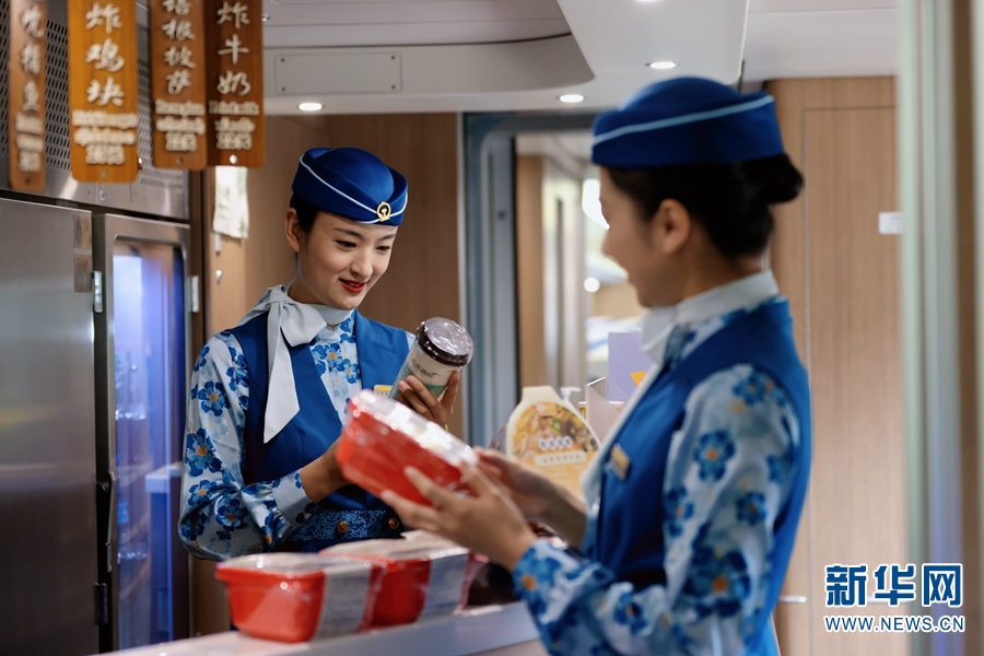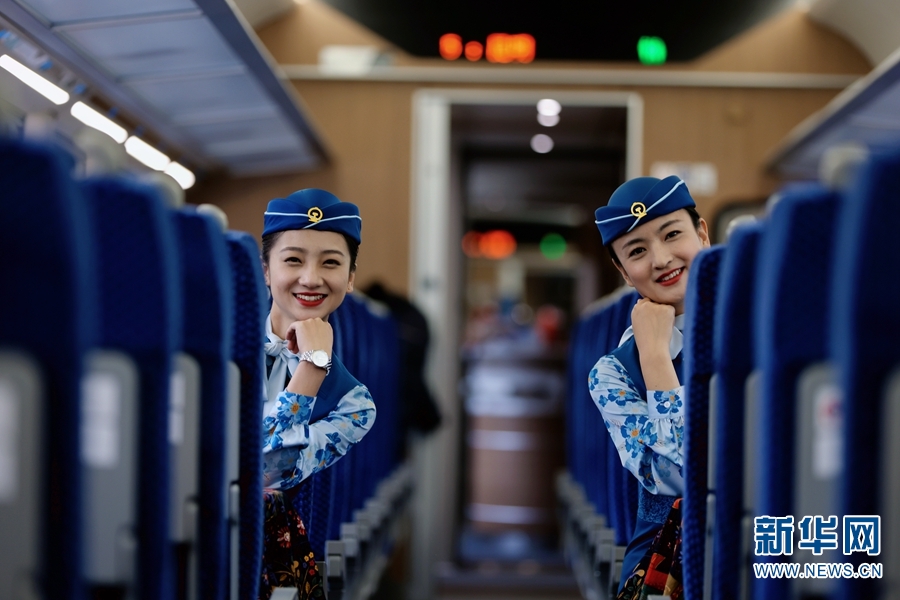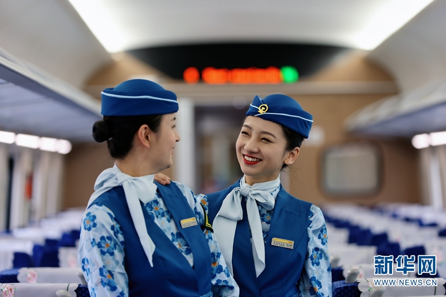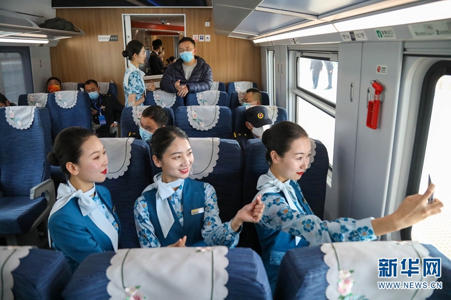 3名身着新款制服的乘务员在列车上自拍留影(摄于11月26日)。(新华网 赵普凡/摄)