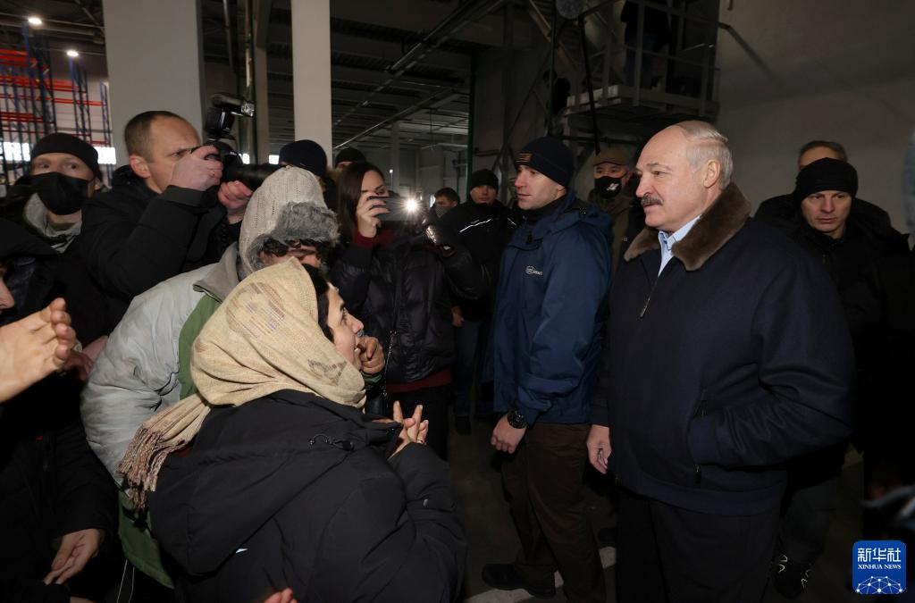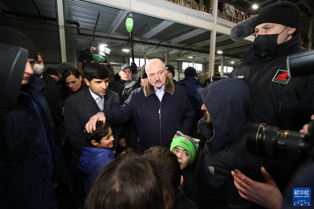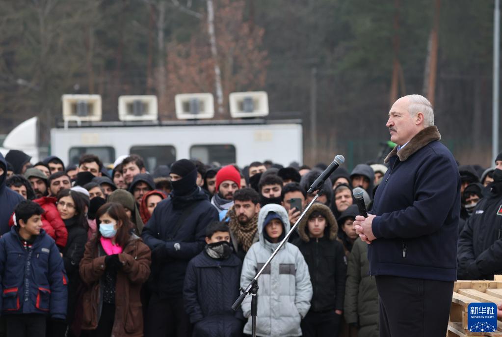 11月26日,在白俄罗斯与波兰边境的布鲁兹吉边境检查站附近的难民聚集区,白俄罗斯总统卢卡申科与难民见面。新华社/白通社