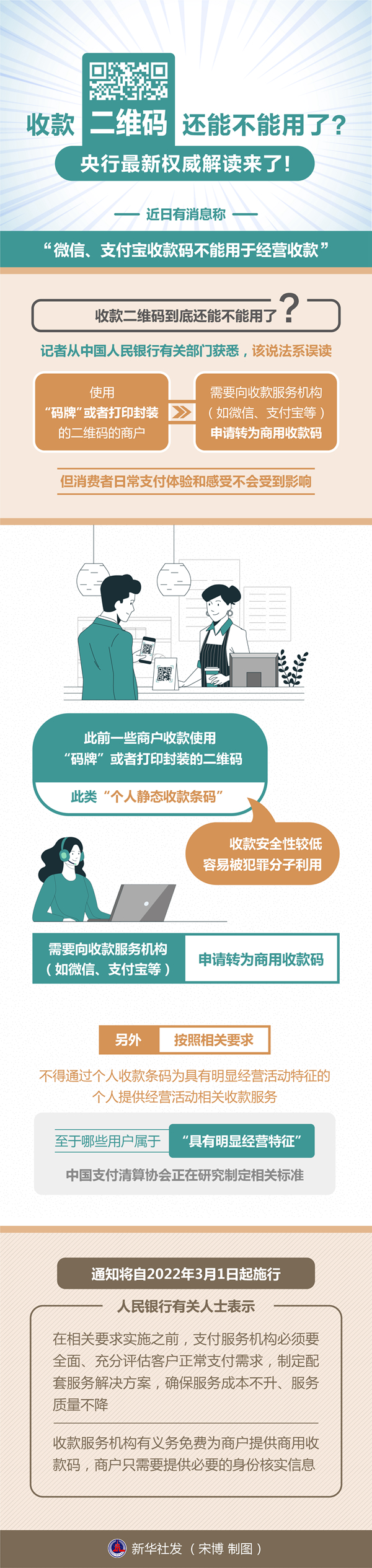通知将自2022年3月1日起施行。人民银行有关人士表示,在相关要求实施之前,支付服务机构必须要全面、充分评估客户正常支付需求,制定配套服务解决方案,确保服务成本不升、服务质量不降。收款服务机构有义务免费为商户提供商用收款码,商户只需要提供必要的身份核实信息。
