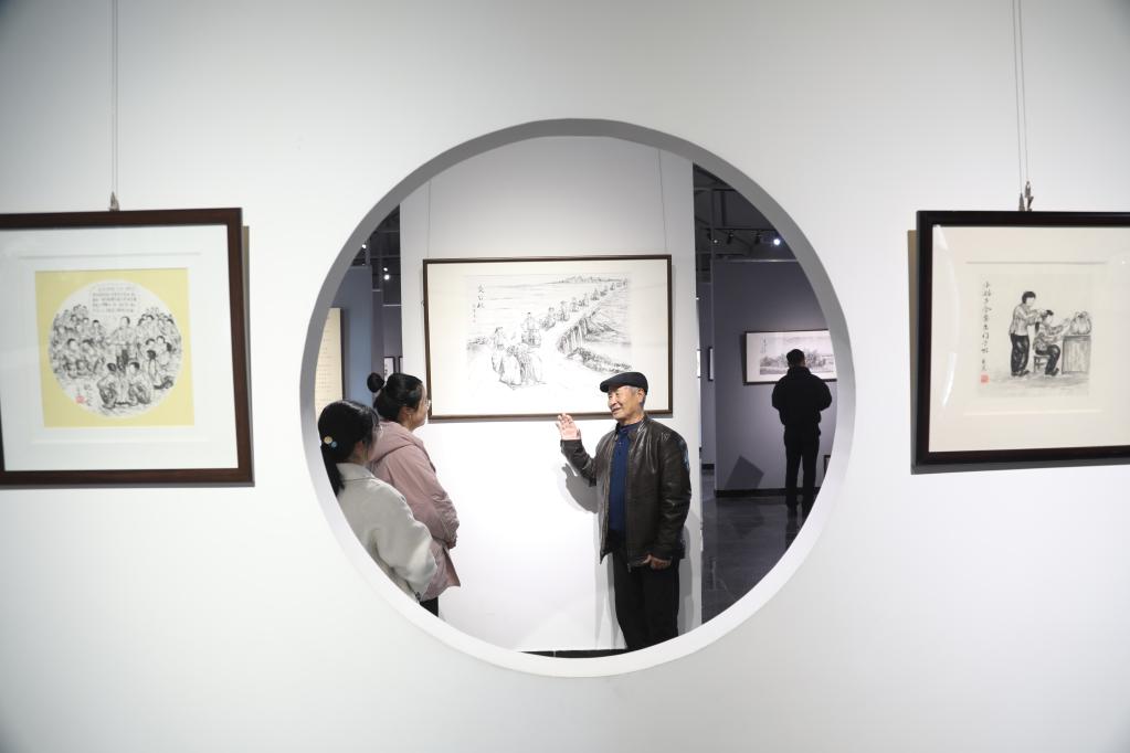 在威海市文登区大水泊镇瓦屋庄村毕克官美术馆,村民王炳勋(右一)向参观漫画展的年轻游客介绍生活变化。(于颖摄)