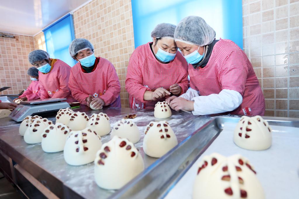 在威海市文登区侯家镇崔家村,农村妇女正在食品生产车间蒸制胶东花饽饽。(文轩摄)