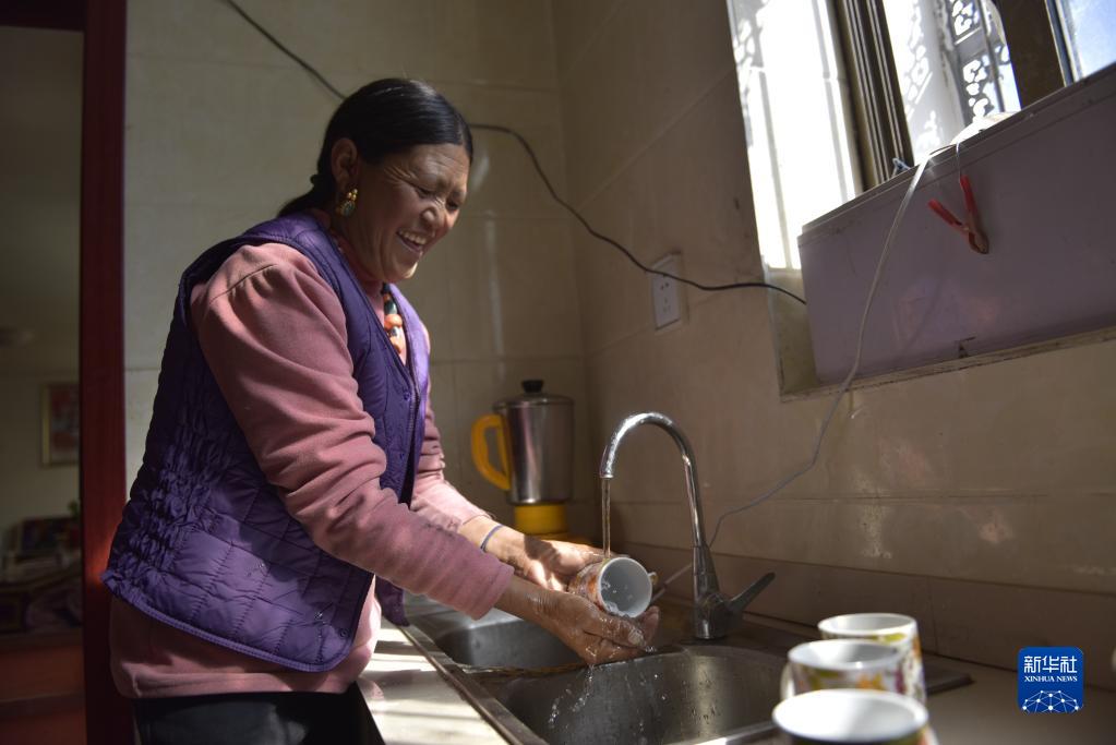 楚鲁松杰乡楚松村楚鲁组村民强白桑姆用入户自来水清洗茶碗(2021年9月18日摄)。新华社记者 格桑朗杰 摄