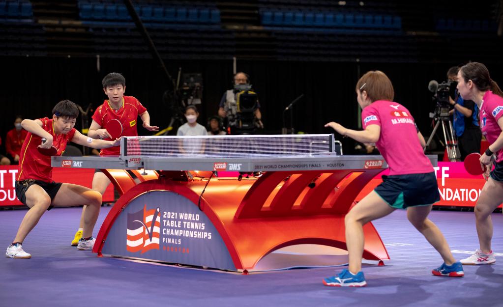 11月27日,王曼昱(左一)/孙颖莎(左二)在比赛中。新华社发(瓦格纳摄)
