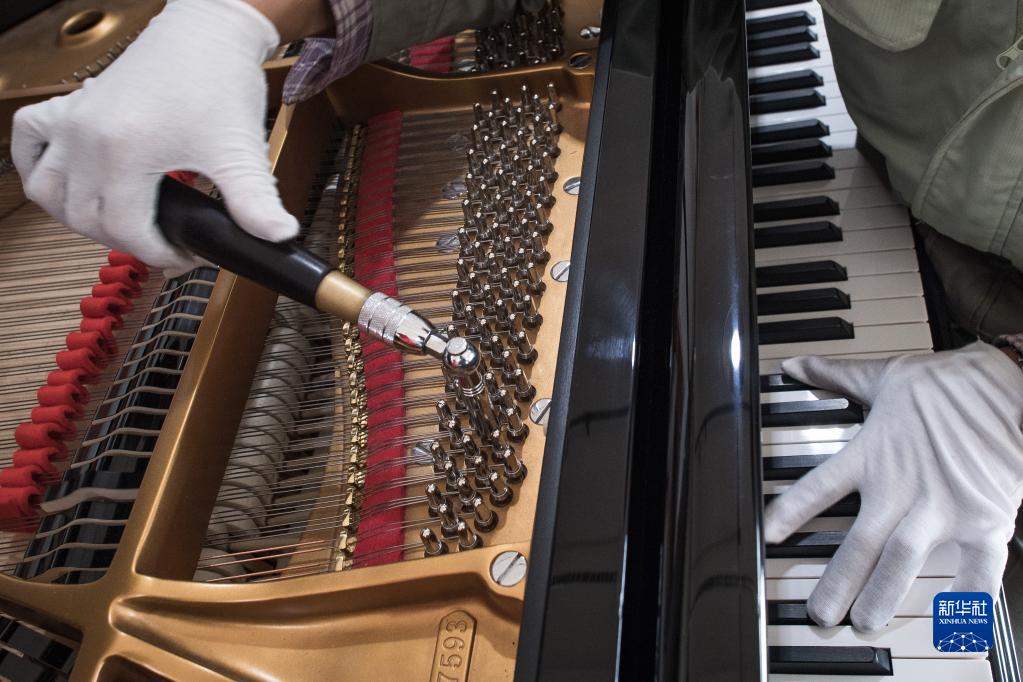 11月23日,工人在柏斯音乐集团宜昌钢琴生产基地调试钢琴。