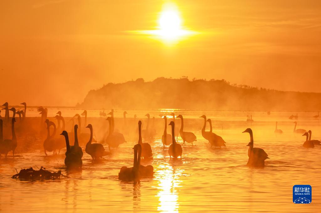 冬日清晨,山东荣成大天鹅国家级自然保护区晨雾袅袅,大天鹅在晨曦中游弋觅食、起舞飞翔,吸引众多游客前来观赏拍照。