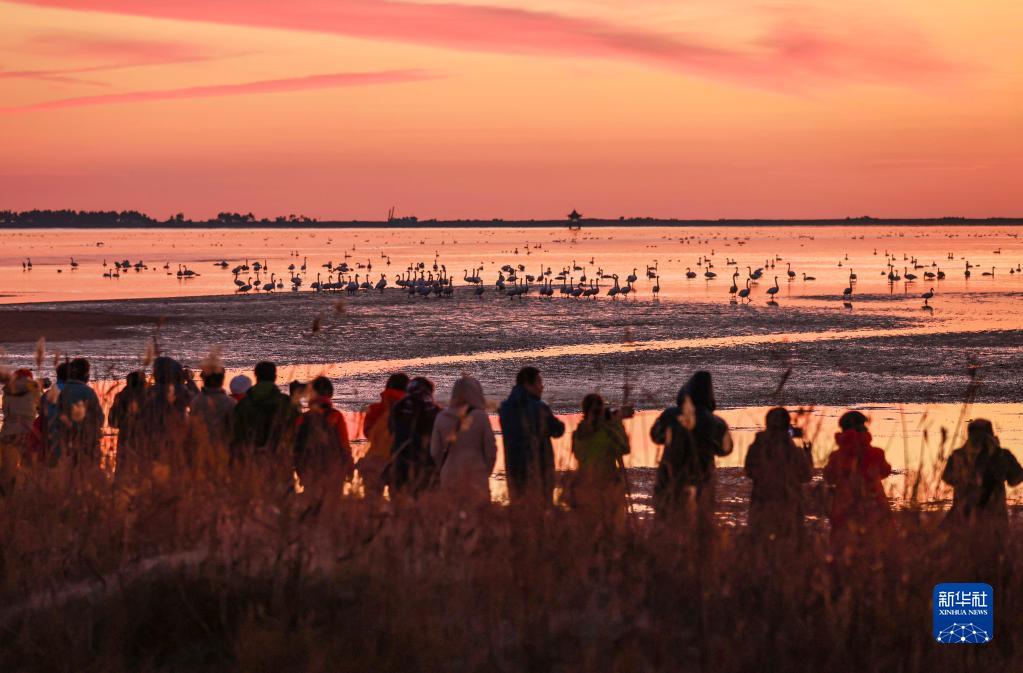 11月28日,在山东省荣成市大天鹅国家级自然保护区的一处湖畔,市民和摄影爱好者在观赏大天鹅。
