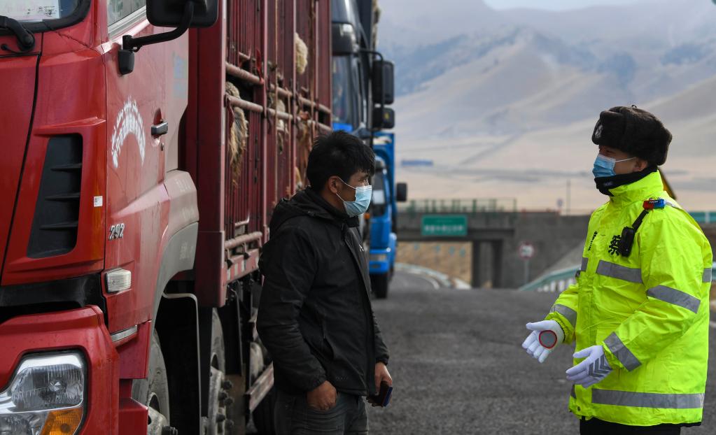 新疆赛里木湖畔,博尔塔拉蒙古自治州公安局赛里木湖景区公安分局交警大队民警王会祥正在向载有牲畜的卡车司机了解车况(11月26日摄)。新华社记者赵戈 摄