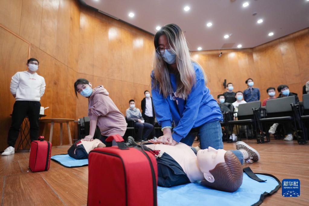 11月28日,清华大学计算机系的冬奥学生志愿者遆周杰(右)在急救技能培训上学习心肺复苏术。新华社记者 鞠焕宗 摄