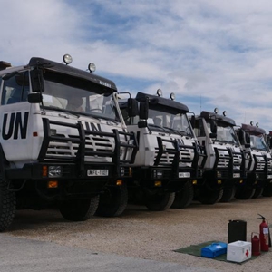 11月26日,在黎巴嫩南部辛尼亚村中国维和营,车辆等装备等待联黎部队司令部核查。新华社发(梁裕源 摄)