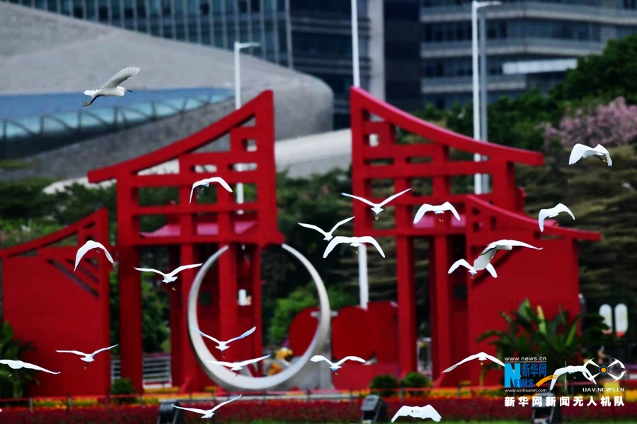 在广州海心沙亚运公园,鸟鸣城中央,成为城市中轴线上一道独特的风景线。新华网发(佘建新摄)