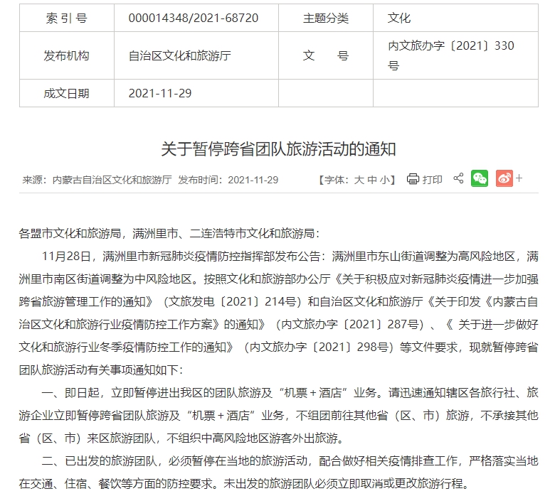 11月28日,满洲里市新冠肺炎疫情防控指挥部发布公告:满洲里市东山街道调整为高风险地区,满洲里市南区街道调整为中风险地区。按照文化和旅游部办公厅《关于积极应对新冠肺炎疫情进一步加强跨省旅游管理工作的通知》(文旅发电〔2021〕214号)和自治区文化和旅游厅《关于印发《内蒙古自治区文化和旅游行业疫情防控工作方案》的通知》(内文旅办字〔2021〕287号)、《 关于进一步做好文化和旅游行业冬季疫情防控工作的通知》(内文旅办字〔2021〕298号)等文件要求,现就暂停跨省团队旅游活动有关事项通知如下: