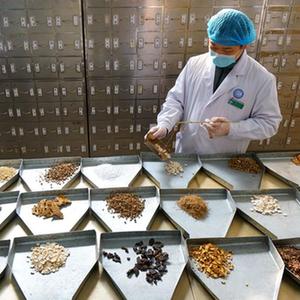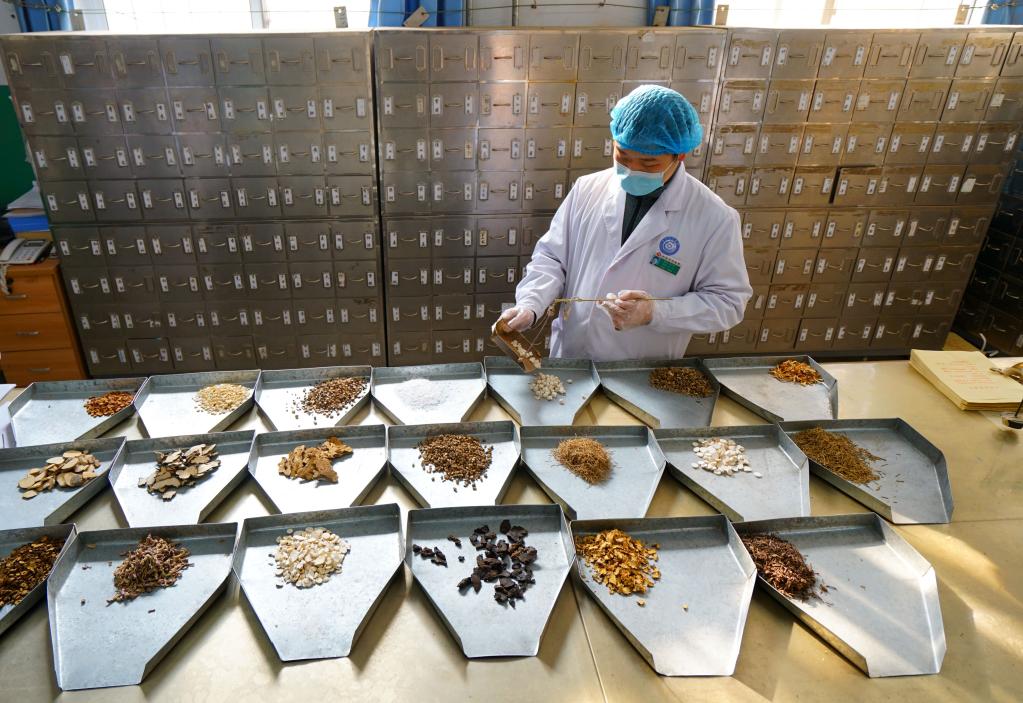 河北省沙河市中医院医护人员正在配中药。(陈雷 摄)