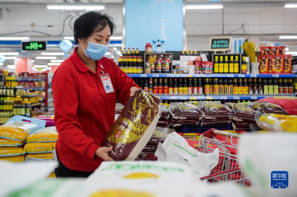 11月30日,在满洲里市庆客隆超市,工作人员在拣货。满洲里市居民可通过线上方式下单,工作人员根据订单拣货后由配送人员送货。