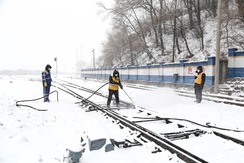 11月30日,绥芬河铁路车站职工在清理冰雪。曲艺伟摄