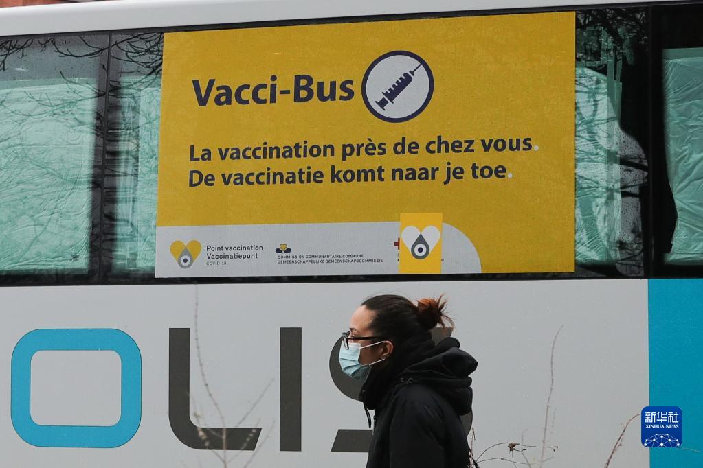 11月30日,一名女子经过比利时布鲁塞尔的一辆新冠疫苗接种巴士。