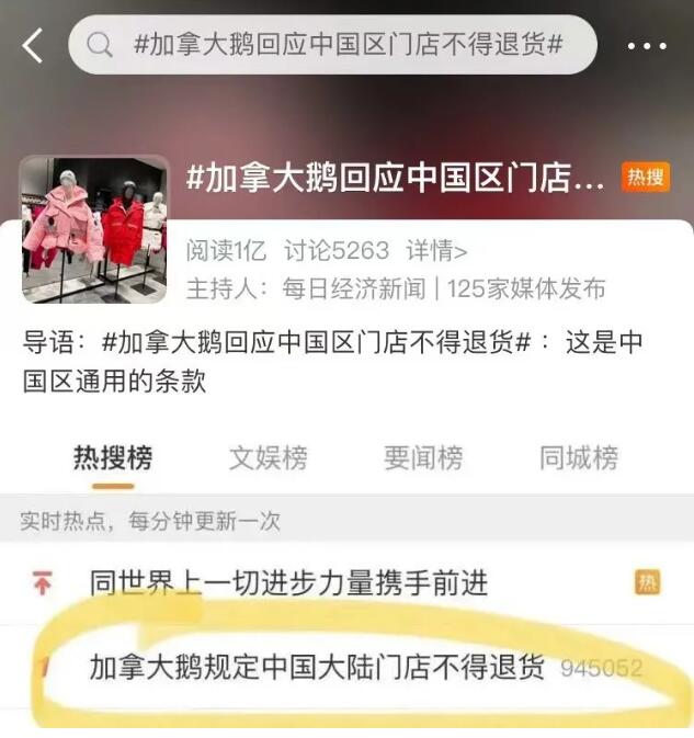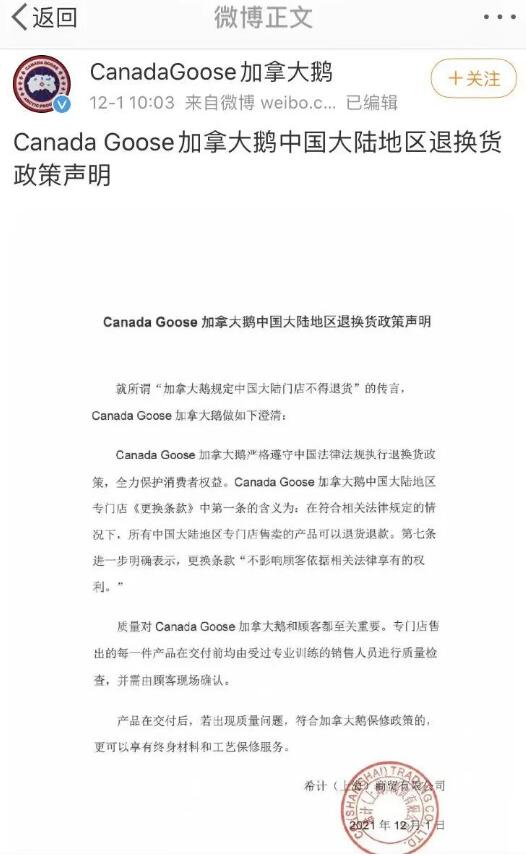 据悉,在约谈会前,加拿大鹅发布声明称在符合相关法律规定的情况下,所有中国大陆地区专门店售卖的产品可以退货退款。