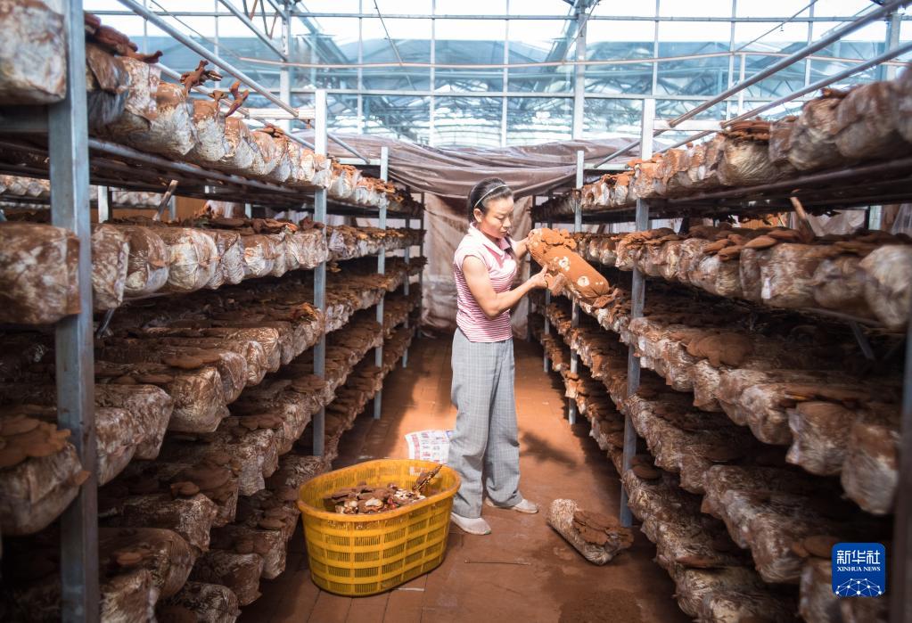 在湖北省十堰市郧阳区青龙泉社区香菇产业基地,易地扶贫搬迁户在大棚中忙碌(2020年8月28日摄)。新华社记者 肖艺九 摄
