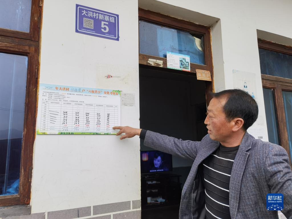 2021年3月12日,贵州省息烽县石硐镇大洪村村民任福荣指着自家的“六权共享”量化考核表。新华社记者 向定杰 摄