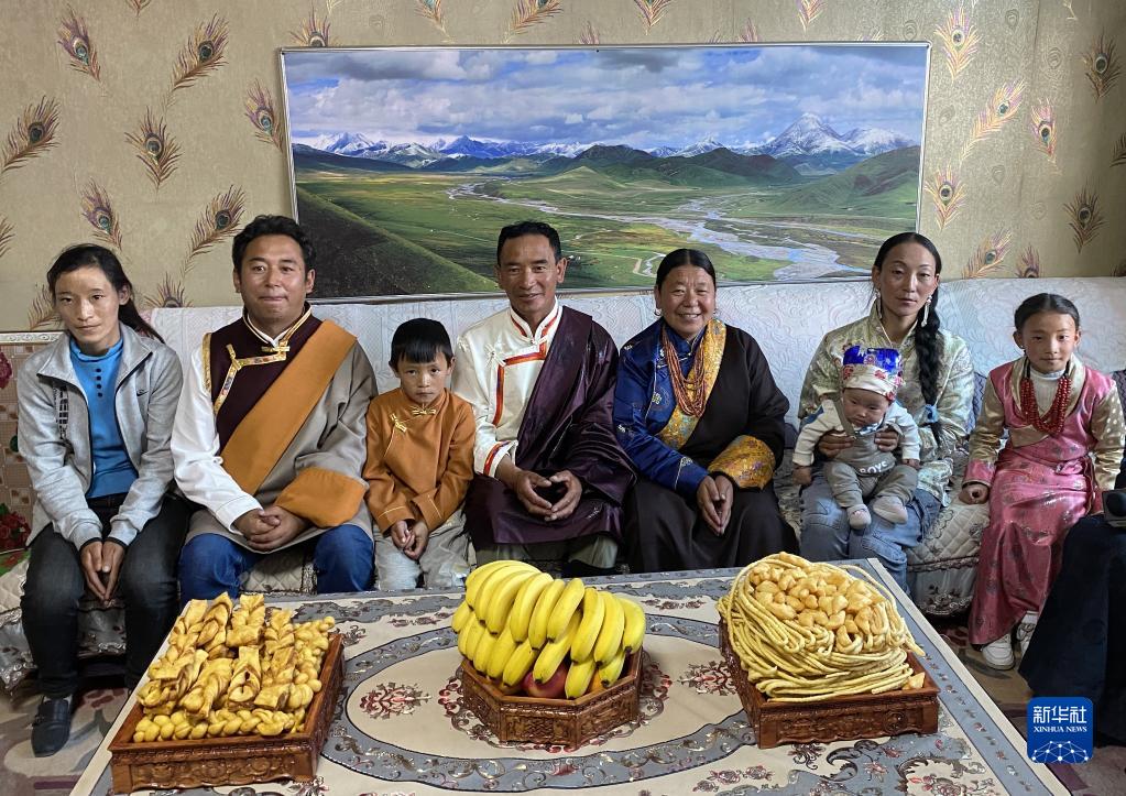 青海省海北藏族自治州刚察县果洛藏贡麻村村民索南才让(左四)和家人在一起(2021年6月8日摄)。新华社记者 吴刚 摄