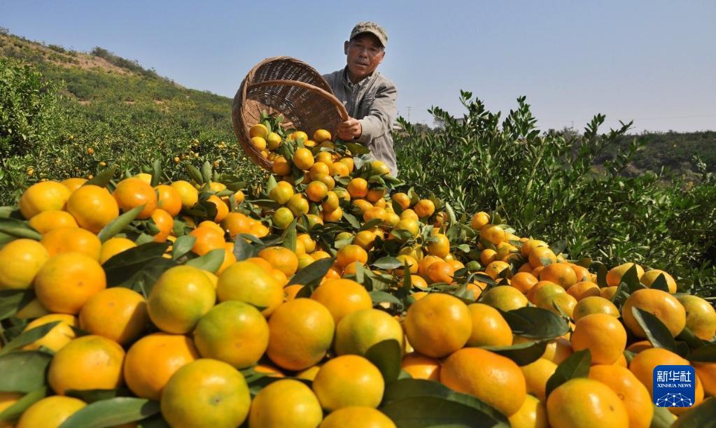 湖北省丹江口市习家店镇村民在收获柑橘(2021年10月8日摄)。新华社发(裴建丹 摄)