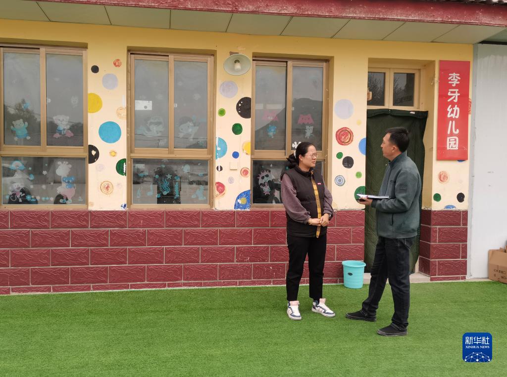 甘肃省临夏回族自治州东乡族自治县那勒寺镇李牙村第一书记马学良(右)到幼儿园了解适龄学生入学情况(2021年10月12日摄)。新华社发