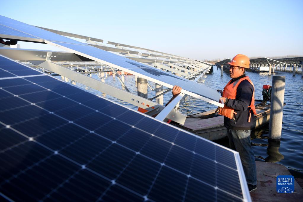 11月24日,工人在安徽省肥东县古城镇蒋集水库“渔光互补”光伏电站建设现场安装光伏板。