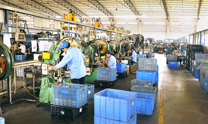 图为广州市益德电热制品有限公司的生产车间里,工人在生产作业。(受访单位供图)