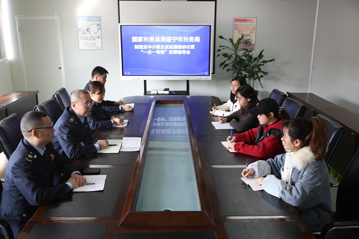 图为四川遂宁市税务局工作人员在四川明泰电子科技有限公司举办“一企一专班”政策说明会讲解缓税政策。(受访单位供图)