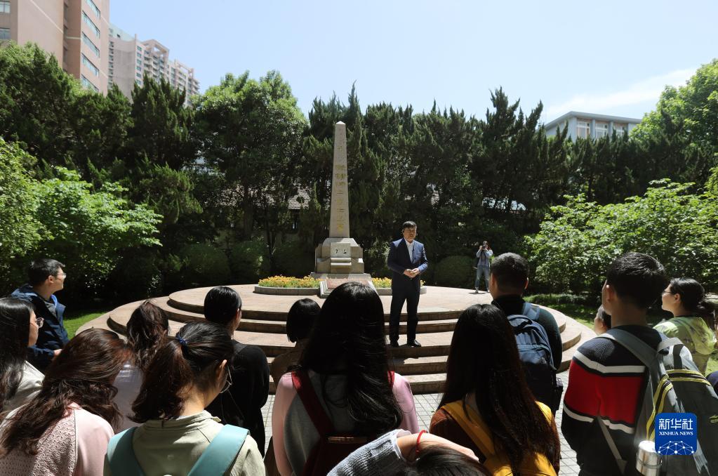 在上海交通大学校园里的史霄雯、穆汉祥烈士墓前,刘统教授在讲述两位烈士牺牲的历史经过(2019年5月7日摄)。