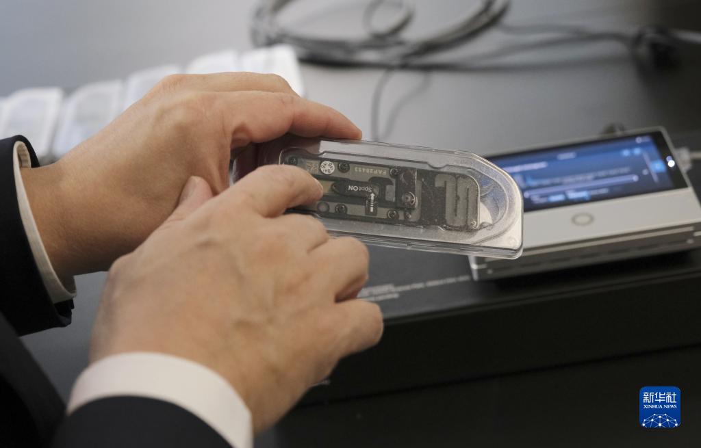 12月1日,在香港中文大学,创新诊断科技中心领头人、中大医学院卢煜明教授介绍小型检测仪器。新华社记者 王申 摄