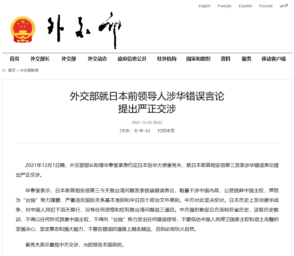 2021年12月1日晚,外交部部长助理华春莹紧急约见日本驻华大使垂秀夫,就日本前首相安倍晋三发表涉华错误言论提出严正交涉。