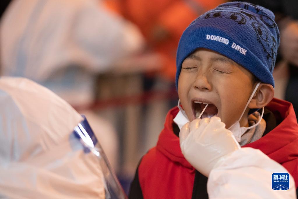 12月2日,在哈尔滨市香坊区安乐街道理工大学核酸检测点,医务人员进行核酸采样。