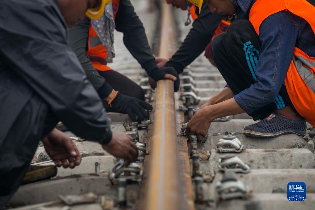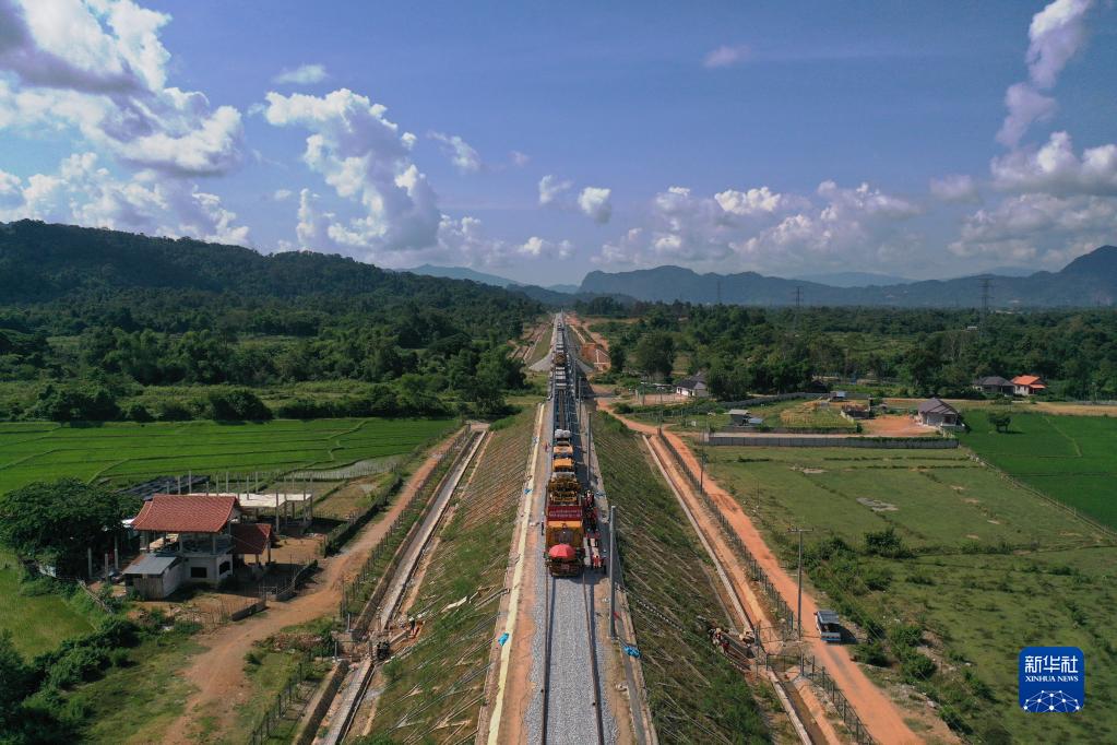 这是2020年6月18日,在老挝首都万象市北郊,中国中铁二局中老员工用螺栓紧固铁轨。新华社发(凯乔摄)