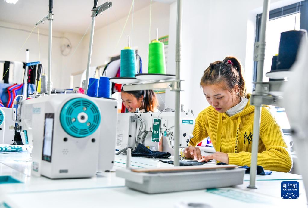 在贵州省威宁县五里岗街道朝阳新城易地扶贫搬迁安置小区,搬迁户在就业扶贫手工车间缝制民族服饰(11月28日摄)。新华社记者 杨文斌 摄