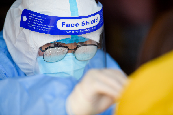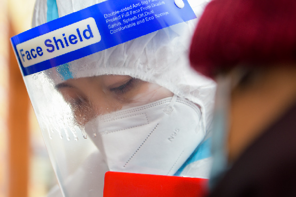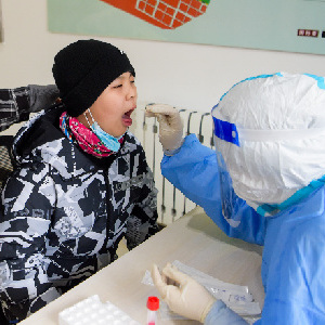 12月1日,在满洲里市碧桂园北湖春色小区核酸采样点,工作人员为居民做核酸采样。