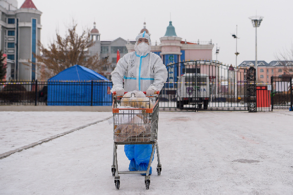 11月29日,在满洲里市东山街道办事处怡园社区府欣小区A区,工作人员运送物资。