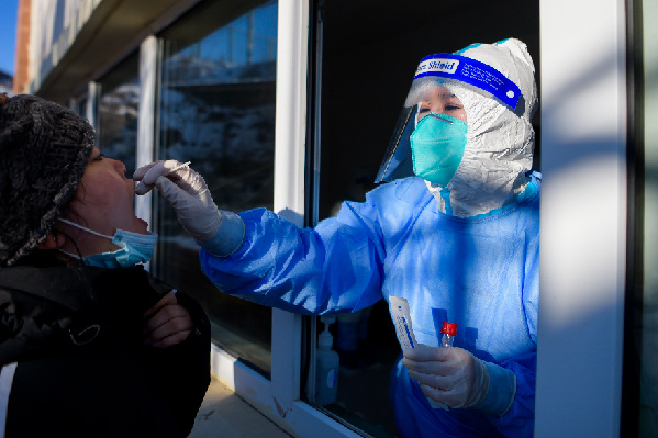 11月29日,在满洲里市东山街道办事处怡园社区府欣小区A区核酸采样点,工作人员为居民做核酸采样。