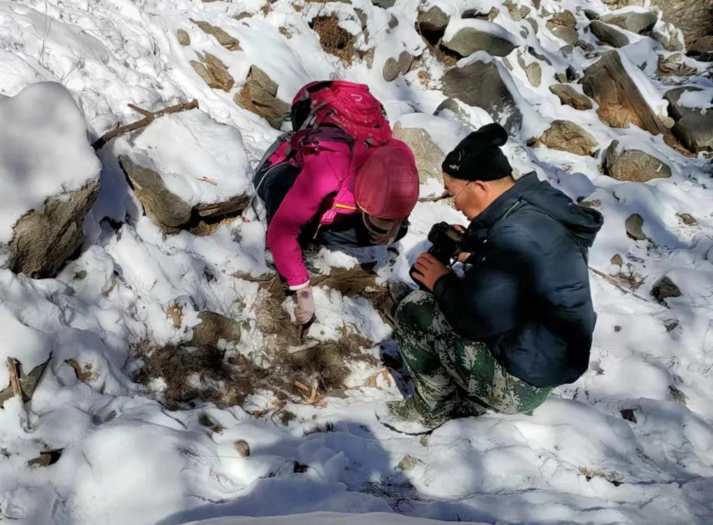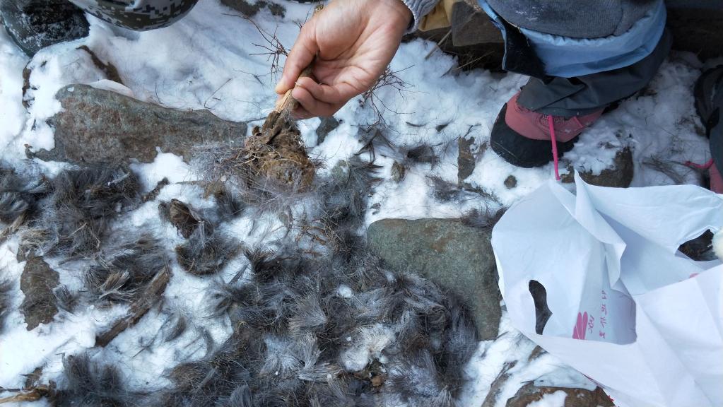 11月30日,专业技术人员在贺兰山内蒙古段水沟子附近发现疑似雪豹捕食岩羊后留下的残骸、粪便及毛发。(受访单位供图)