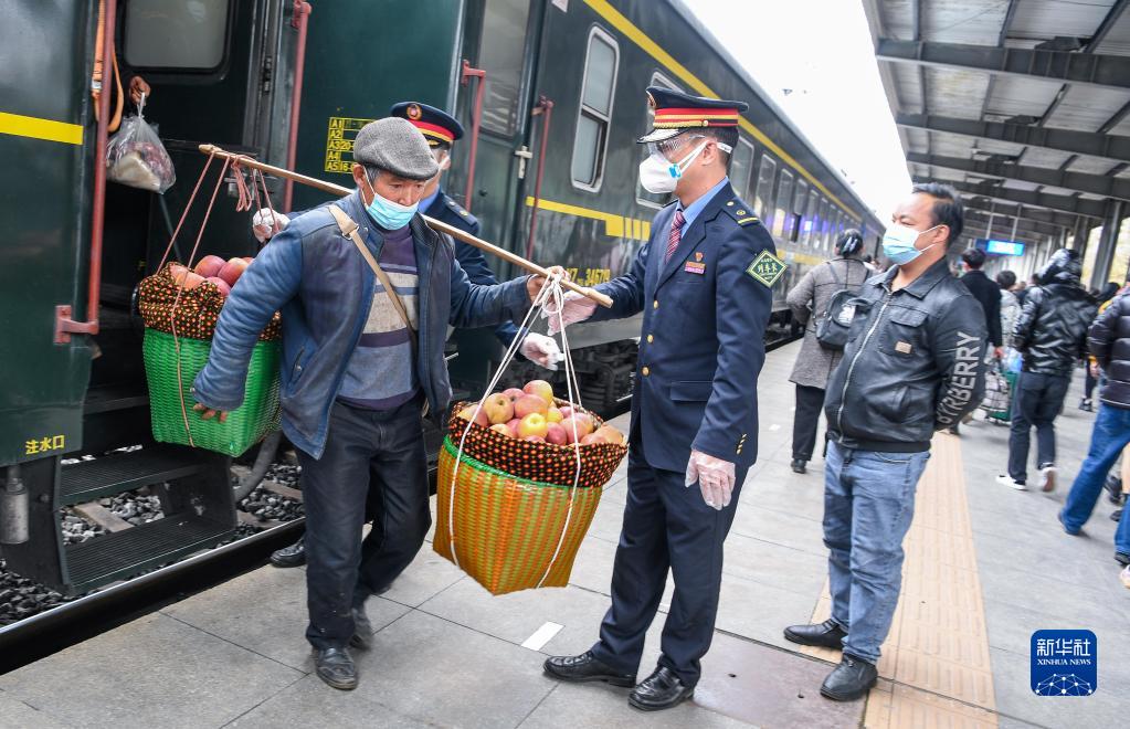 11月30日,云南省昭通市的果农乘坐5647次列车抵达贵州草海站下车。