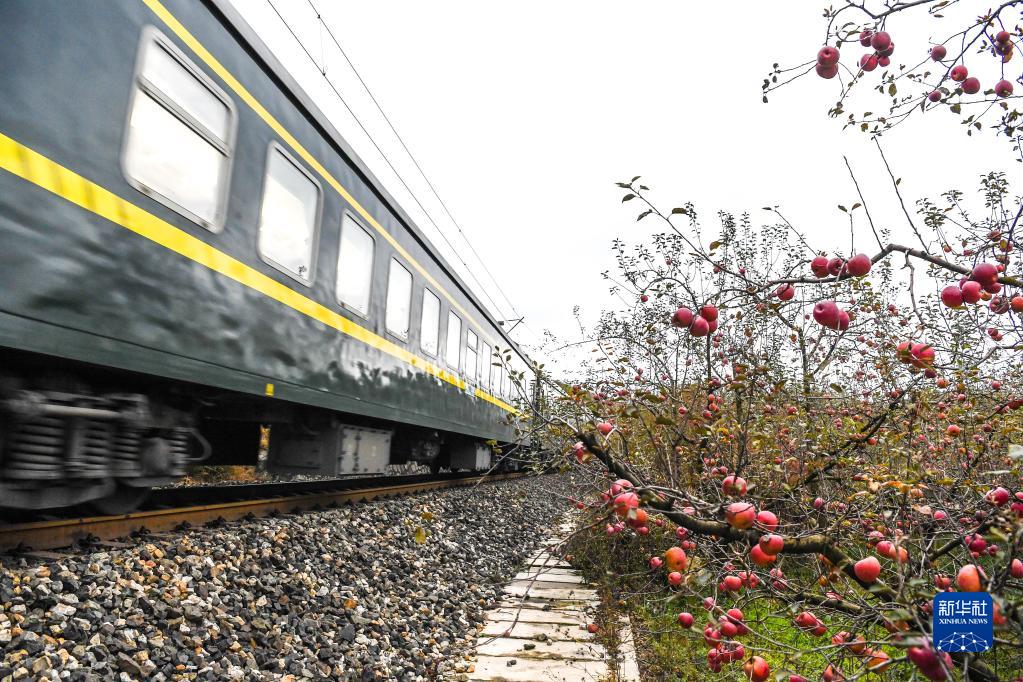 11月29日,一列绿皮火车从云南省昭通市昭阳区小龙洞乡小龙洞村的苹果园旁驶过。