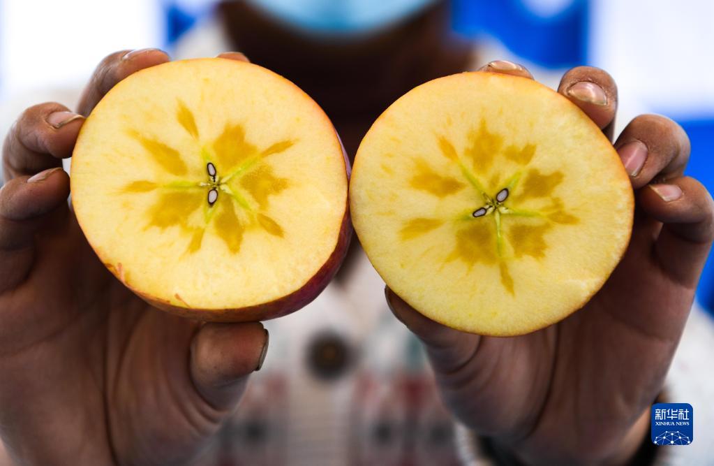 11月30日,果农在5647次列车上展示自家种植的糖心苹果。