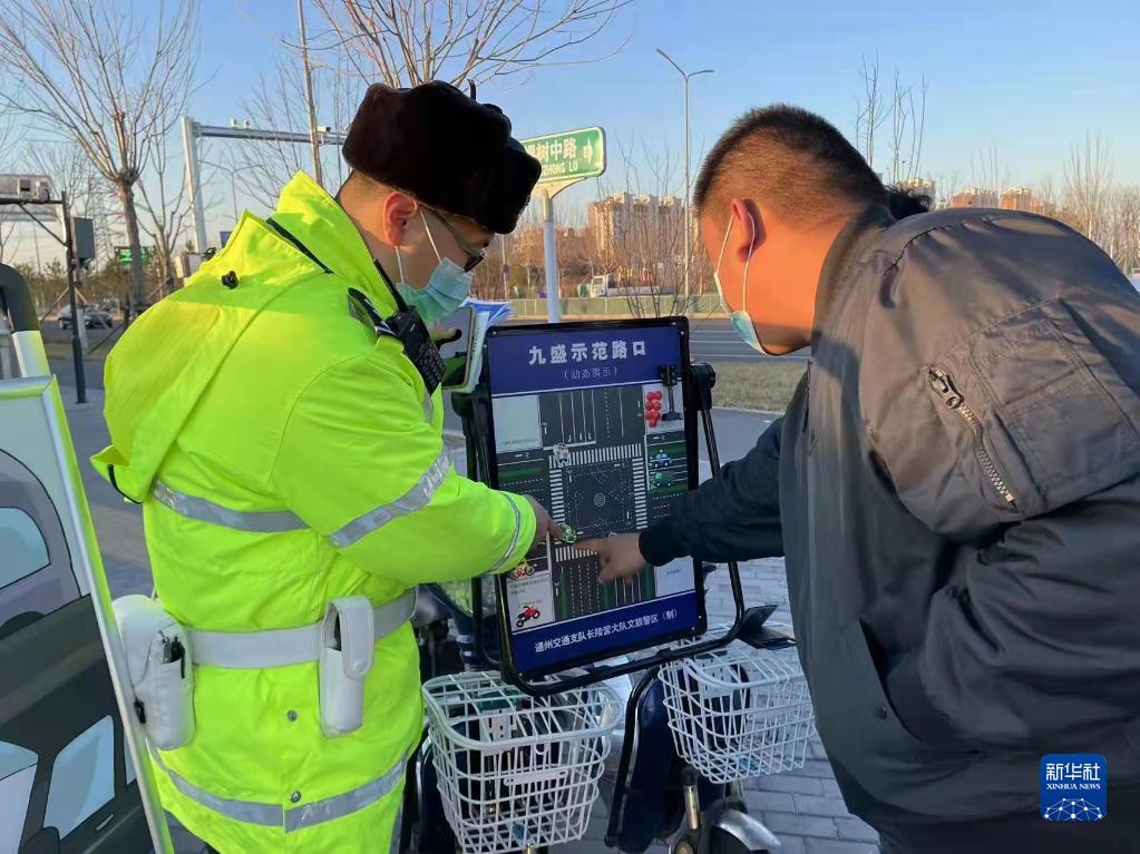 图为日前通州交通支队长陵营大队在九盛路口示范岗开展的现场交通宣讲活动。通过发放《文明骑行者倡议书》和路口通行示意图等形式进行宣传,并在演示板上对礼让斑马线进行讲解。(通州交通支队供图)
