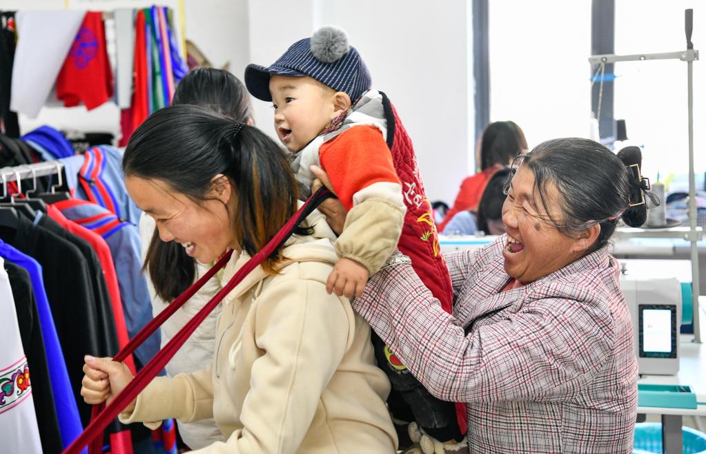 在贵州省威宁县五里岗街道朝阳新城易地扶贫搬迁安置小区,搬迁户在就业扶贫手工车间可以一边就业,一边带孩子(11月28日摄)。新华社记者杨文斌摄