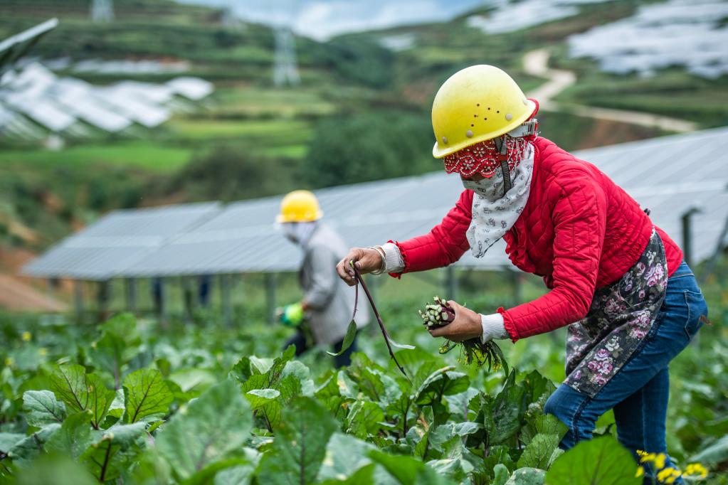 贵州省威宁县村民在仙水窝光伏电站采摘红菜苔(8月24日摄)。新华社记者陶亮摄
