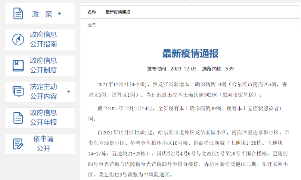 2021年12月2日0-24时,黑龙江省新增本土确诊病例10例(哈尔滨市南岗区6例、香坊区3例、道外区1例)。当日治愈出院本土确诊病例3例(黑河市爱辉区)。