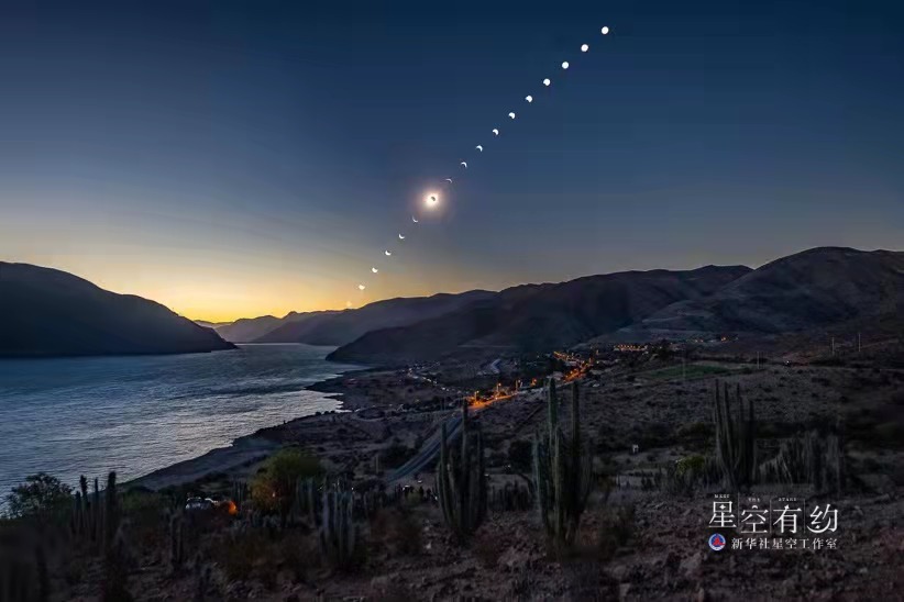 ↑重庆市天文摄影爱好者戴建峰2019年7月2日在智利阿塔卡马沙漠拍摄的“日全食葫芦串”。(本人供图)