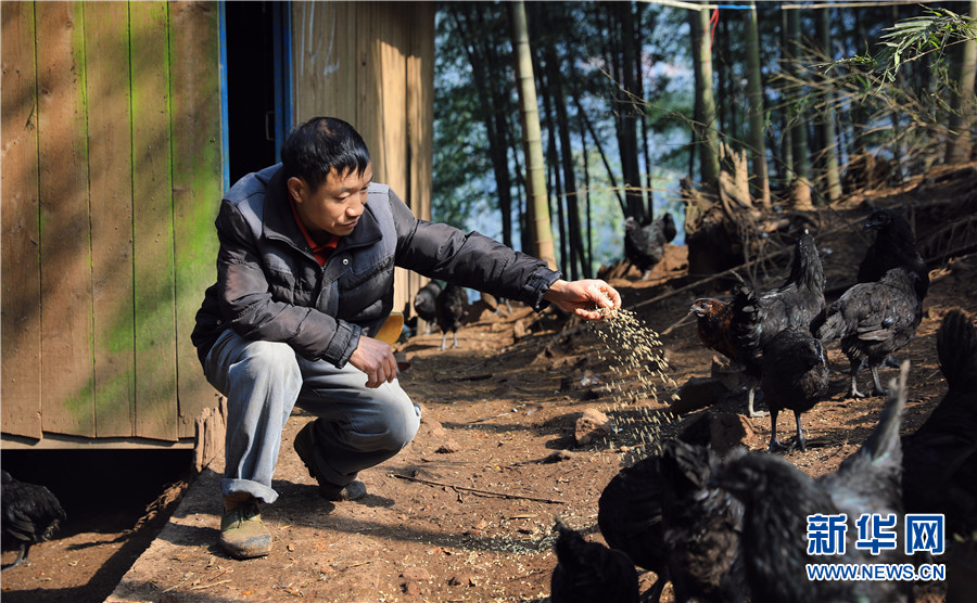 12月2日,董兴彬在宝源乡林下乌骨鸡养殖示范基地内喂鸡,公司每年可以向成渝地区卖出50万羽左右的商品鸡。新华网 卢志佳 摄