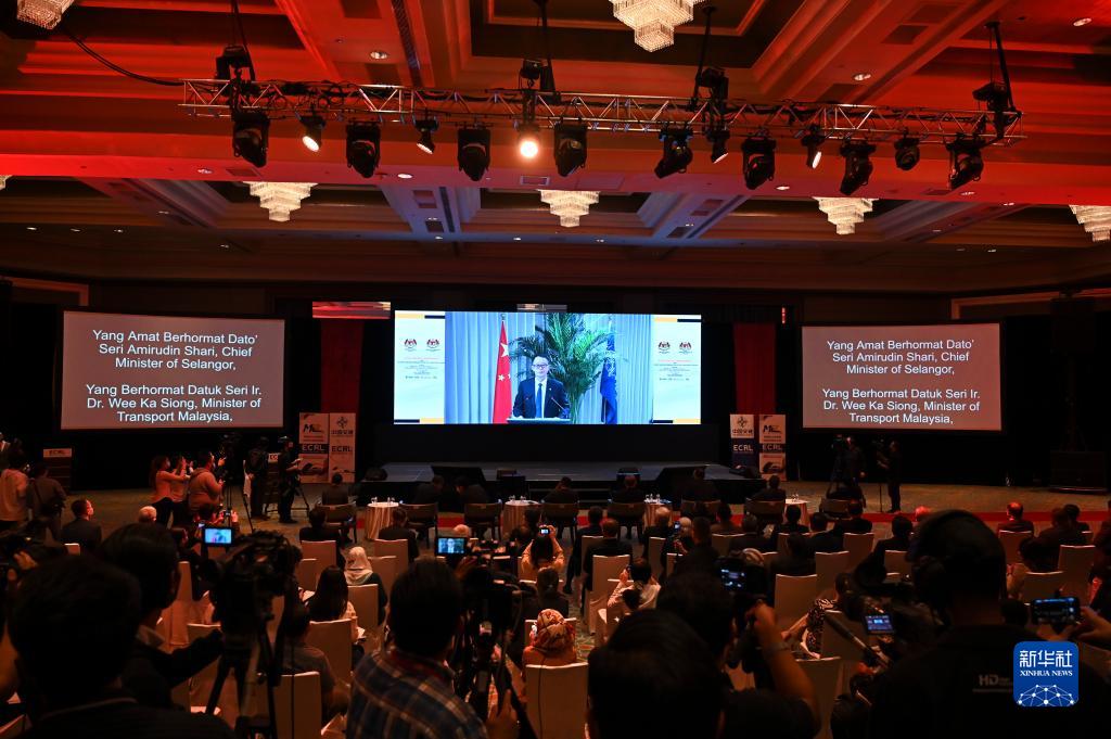 12月2日,中国交建总裁王海怀通过视频连线在马来西亚东海岸铁路项目C段北线文件移交仪式上讲话。新华社记者 朱炜 摄