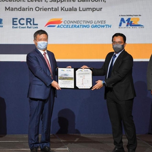 当天,在马来西亚交通部长魏家祥和雪兰莪州州务大臣阿米尔丁的见证下,项目业主马来西亚铁路衔接公司首席执行官达尔维斯向中国交建马东铁项目总经理孔琦交接文件。