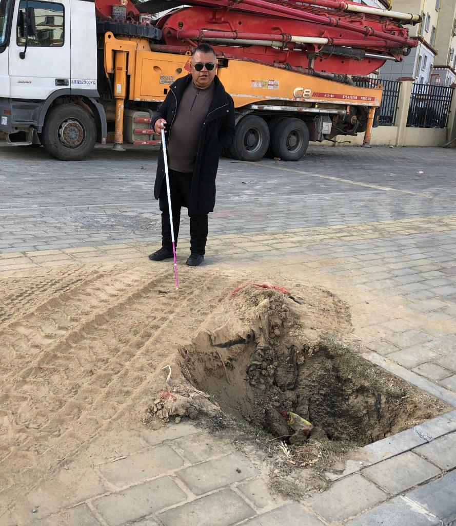斯勇在路上行走,盲道旁边有一个绿化树木被挖掉后形成的大坑。新华社记者 金一清 摄